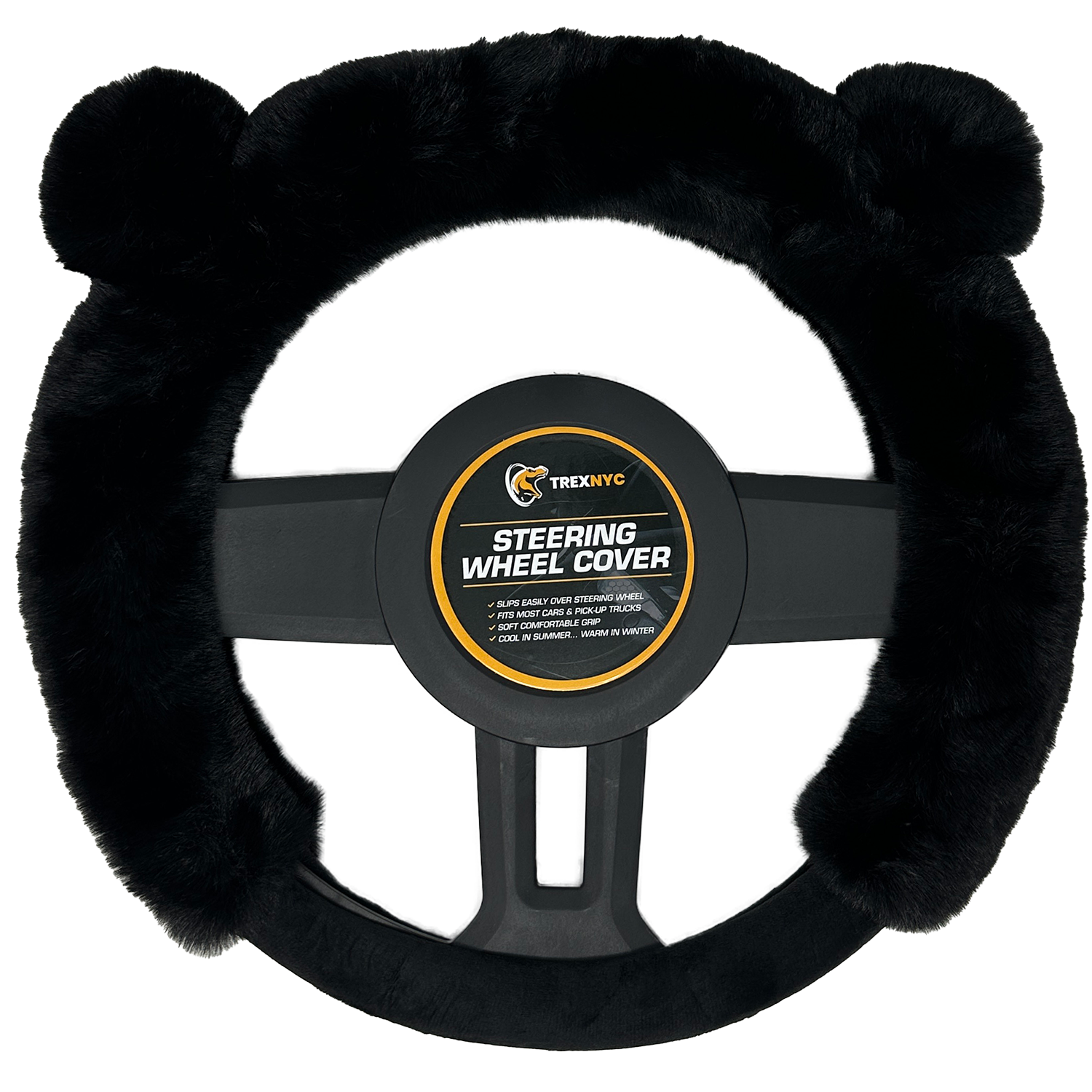 TrexNYC Steering Wheel Cover, Fur Ear - Black/Black