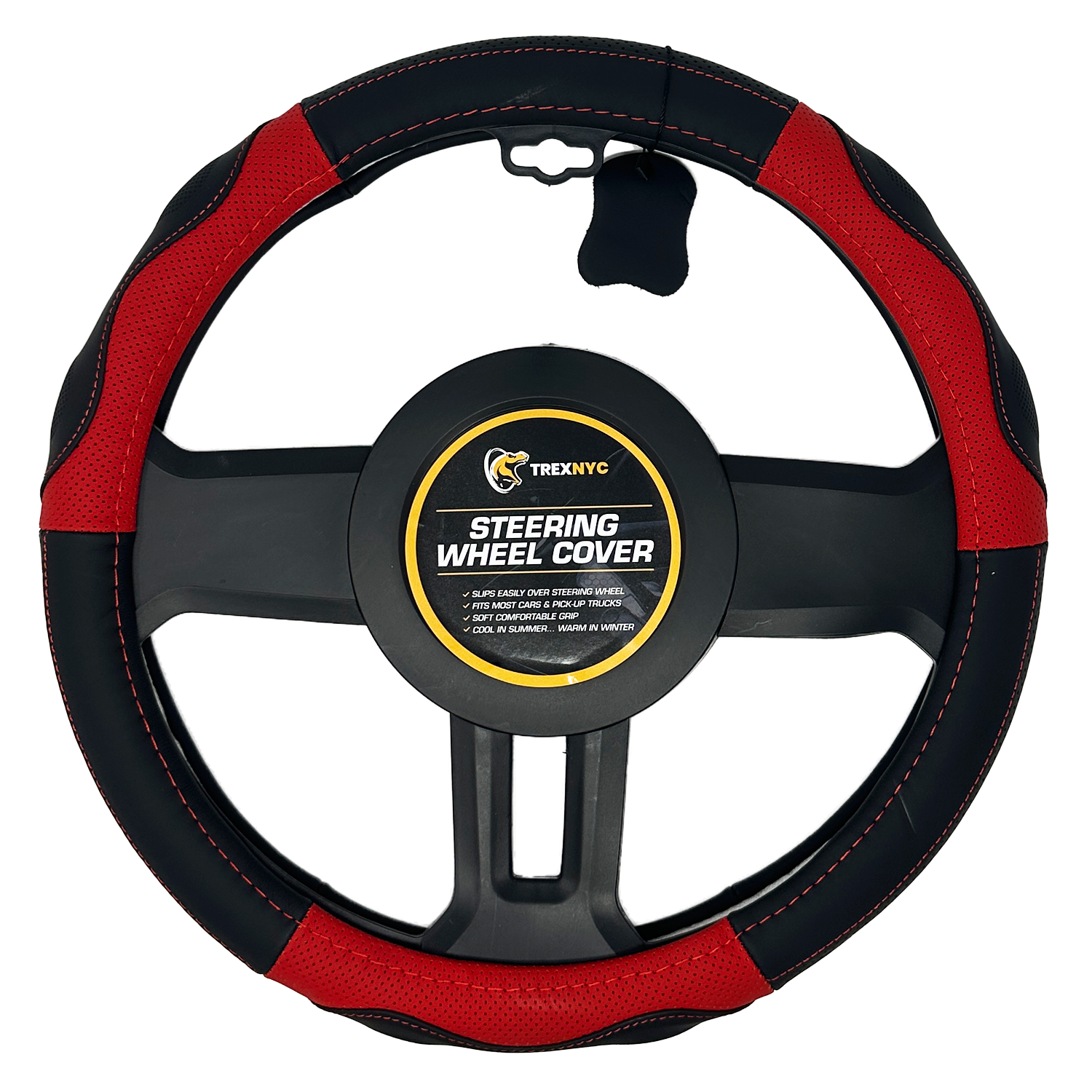 TrexNYC Steering Wheel Cover, Genuine Leather - Black/Red